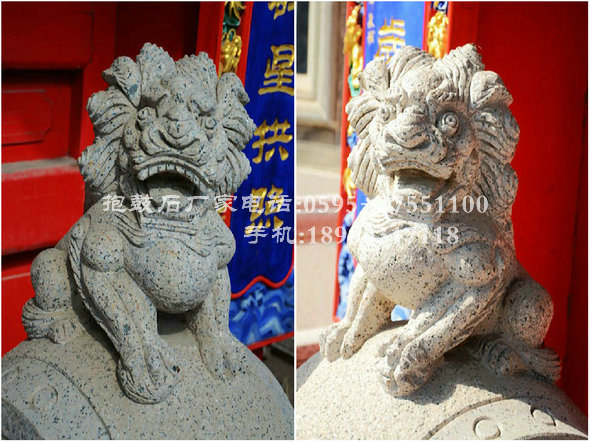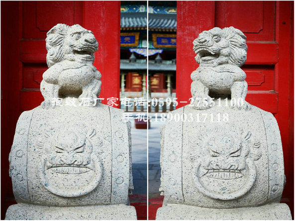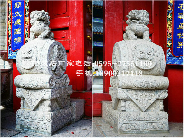 抱鼓石紋樣豐富多彩。鼓座上多浮雕牡丹、荷花、葵花以及如意紋、卷草紋、祥云紋等吉祥紋樣,寓意花好吉祥。鼓面雕刻常運(yùn)用淺浮雕與高浮雕結(jié)合的手法。因獅者為獸中之王,獅紋也成為抱鼓石最常見紋樣,以此顯示舊時豪門大戶的威嚴(yán)。 另外,鼓是法事專用的樂器,抱鼓石還可看作能夠驅(qū)邪避災(zāi)的法力象征,因而在佛寺、祠堂等大門兩側(cè)也常擺放抱鼓石。