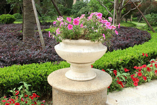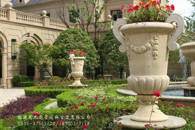 石材花缽可放在臺階或小區(qū)入口兩側,屹立于景墻之上,廣場的中心,水池邊上,單元入口或擺放于街邊。既可以獨自成景,與水中的倒影交相輝映,又可以和噴泉一道形成優(yōu)美的旋律。
