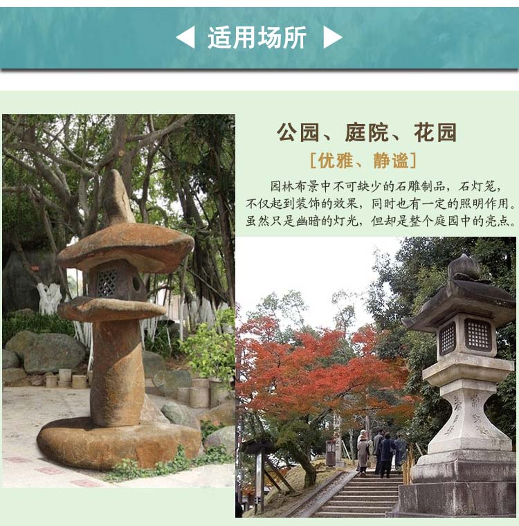 石燈籠是日本石文化的重要內容之一,也是近年來我國出口日本石制品的一個重要品種。石燈籠在日本有著非常悠久的歷史。在佛前獻燈火是佛教的重要禮儀之一,自奈良時代 (公元 710~ 794年 )起日本在修建寺院時就開始在寺院的正面建造石燈籠以保護向寺院所獻的燈火。日本現(xiàn)存的最古老的石燈籠是奈良時代的當麻寺石燈籠,距今已有一千多年的歷史了。到了江戶時代 (公元 1603~ 1867年 )石燈籠在日本已廣為流傳,一些寺院里造型精美的石燈籠被作為樣本模仿雕刻以至形成了石燈籠的各種形式。石燈籠被用于園林、庭院的裝飾始于十六世紀晚期的安土桃山時代,當時由于茶道的大發(fā)展,石燈籠常被作為茶室的一種露天裝飾物而廣泛進入庭院裝飾。隨著石燈籠用途的改變,石燈籠的樣式也就更加多樣化了,例如出現(xiàn)了三腳或四腳的雪見燈籠,同時對竿和笠的部分也給予新的設計,石燈籠的式樣由模仿進入創(chuàng)新?,F(xiàn)在日本的石燈籠除了少量用于寺院神社以外,大多數(shù)的石燈籠是用于庭院、園林裝飾使用。