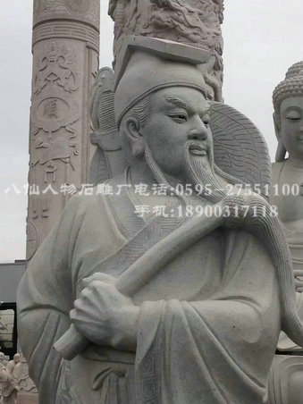 呂洞賓:頭戴瓦棱帽,攀身披道袍,腰系絲帶。身背青鋒劍,手執(zhí)拂塵,腳穿云頭靴,面目方正,留三綹長須,于道貌岸然中略帶幾分風流相。