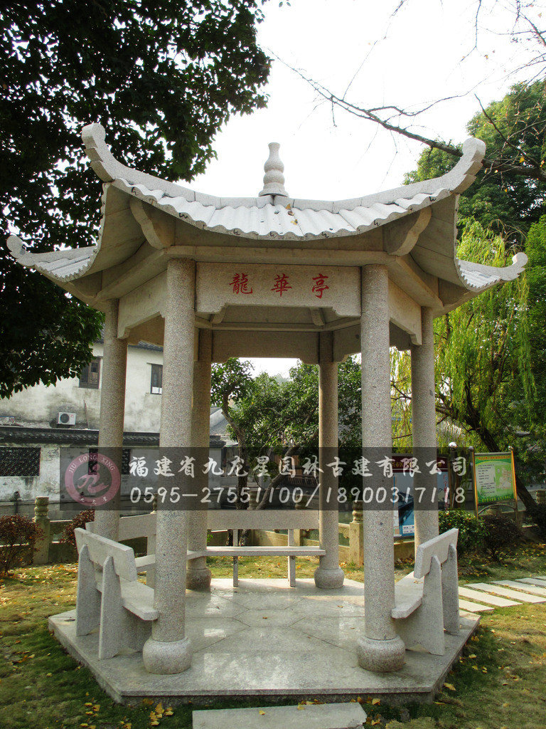 石雕涼亭是指用石頭加工而成的亭子,多建于路旁,供行人休息、乘涼或觀景用。石雕涼亭體量小,平面嚴(yán)謹(jǐn)。自點(diǎn)狀傘亭起,由簡(jiǎn)樸而龐大,根本上都是規(guī)矩多少形體,或再加以組合變形,沒有圍墻。