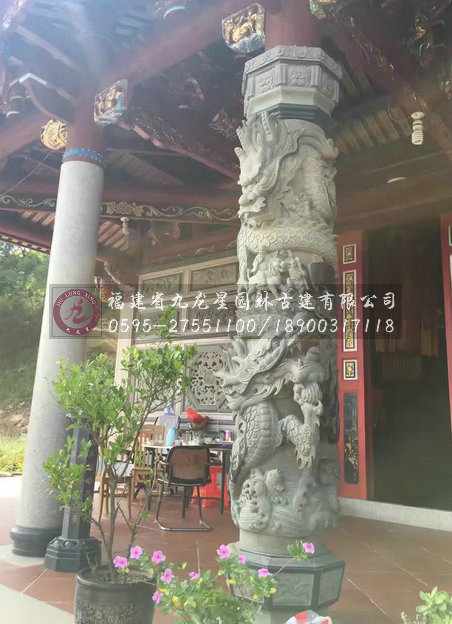 青石龍柱自清代以后大量出現(xiàn),因青石“韌”,宜精雕細(xì)刻。若按鏤雕深淺計(jì)算,具體可分為蟠龍柱、人物柱、花幕柱、八仙柱等;龍柱則又有淺浮雕與高浮雕之別,“白龍”柱基本是淺浮雕,而“青龍”基本是透析度極高的高浮雕。在龍的數(shù)量上區(qū)分,有單龍的盤(pán)繞柱,雙龍戲珠的柱子。而最為別致的是,“福龍”系列中聚成了閩南石雕龍柱的靈魂、寄托閩南人民的希望的“翻天覆地龍柱”。此外,可以按石柱本身的形狀分為方柱、八棱柱、六棱柱等等。